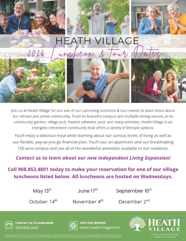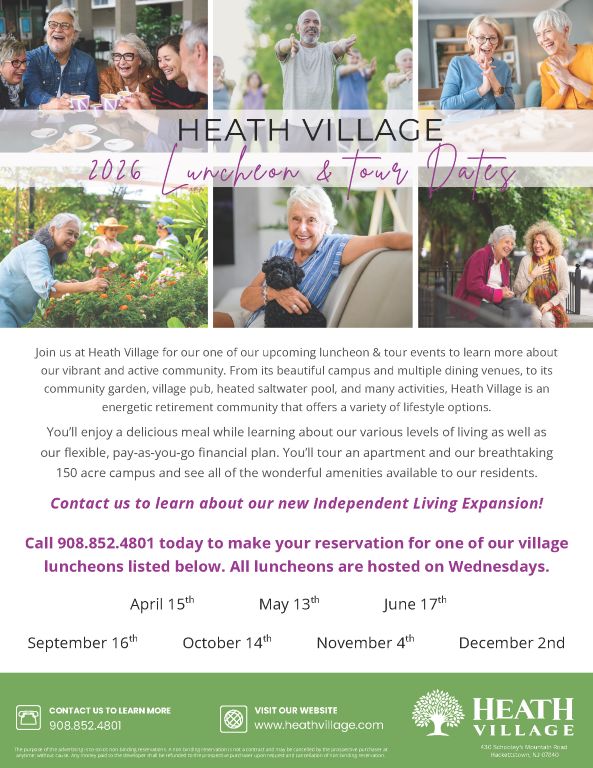 Located in scenic western, Morris County on a beautiful 100+ acre campus, Heath Village represents an affordable choice for today’s retiree who wants to remain active, involved and independent. A non-profit, full service retirement community, Heath Village offers a choice of lifestyle options, first-rate amenities, numerous social opportunities and the security of comprehensive health care services on-site. We invite you to visit us today and learn more about life at our warm and wonderful community.